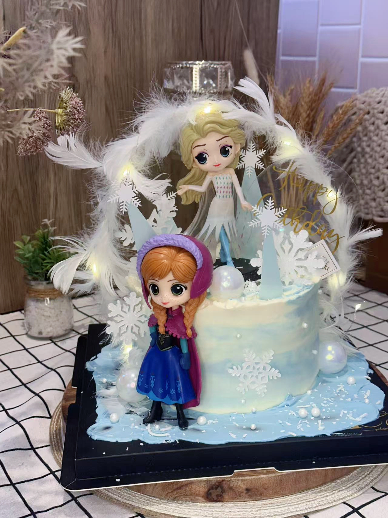 Designed with vibrant details and elegant touches, this Frozen birthday cake features beloved characters Elsa and Anna as figurine toppers. The cake is elegantly wrapped in soft blue and white buttercream shades, symbolising snow and winter skies. Decorated with delicate snowflakes, pearl sprinkles, and glowing feather lights, it’s a magical centrepiece for any birthday celebration.