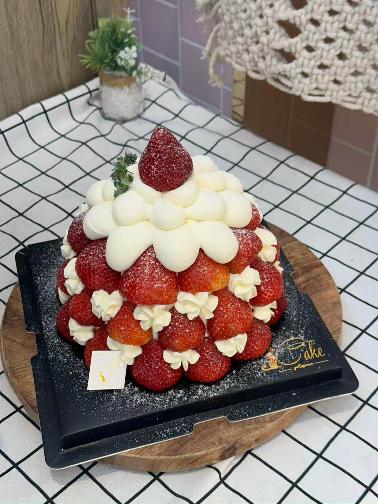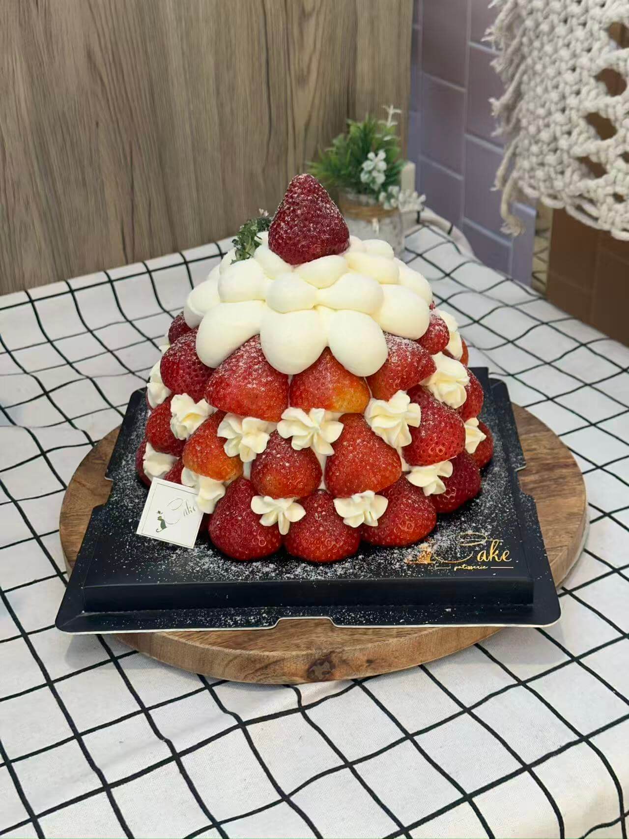 Designed not just for taste but also for visual delight, this cake is perfect for those who love Christmas-themed desserts. The pyramid arrangement of vibrant strawberries creates a visually striking effect, making it an ideal addition to your festive table or a show-stopping dessert at holiday parties. It’s more than a cake – it’s a centerpiece that will impress your guests and create memorable moments.