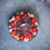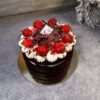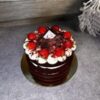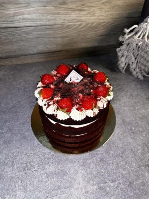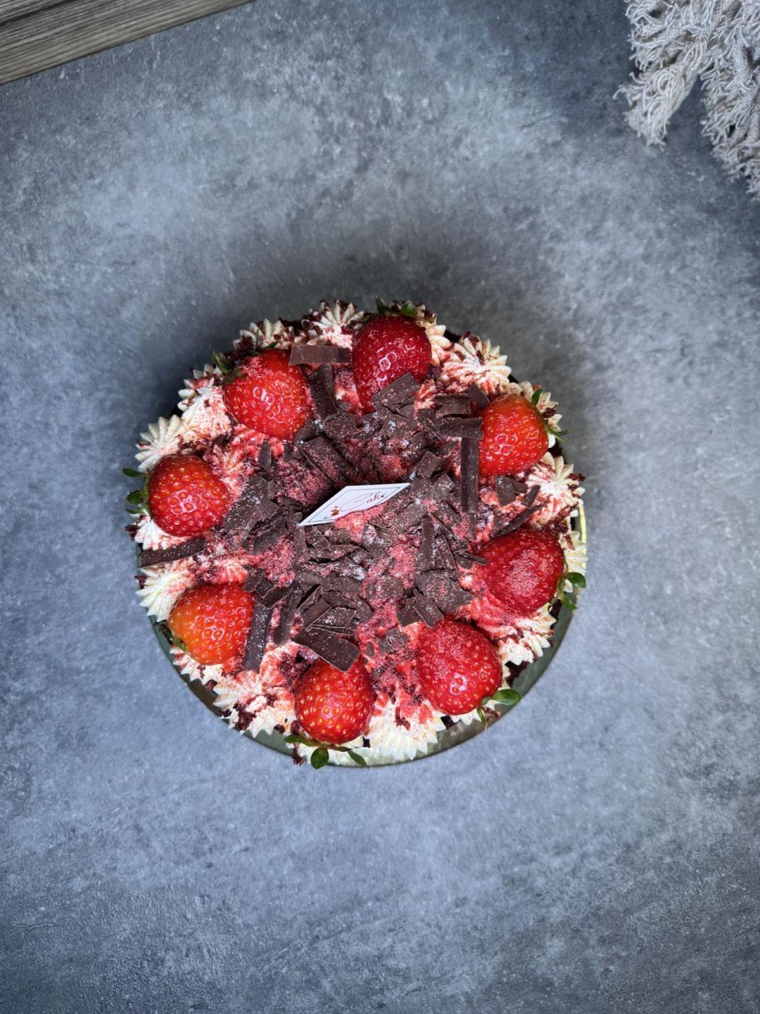 Fresh strawberries are carefully placed on top, bringing a vibrant pop of color and natural freshness. The strawberries not only enhance the visual appeal but also add a bright, fruity note that elevates the overall flavor profile. The final result is a cake that feels luxurious, modern, and high-end, perfect for customers seeking an elevated dessert experience.