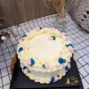 The highlight of this cake lies in its charming miniature floral accents. Soft pink and gentle purple cream flowers are thoughtfully placed around the cake, adding a playful yet sophisticated dimension. These flowers, paired with subtle green cream leaves, create a harmonious color palette that enhances the cake’s vintage aesthetic. Perfectly balanced in size and arrangement, these small floral embellishments bring a whimsical elegance that turns this cake into the centerpiece of any gather