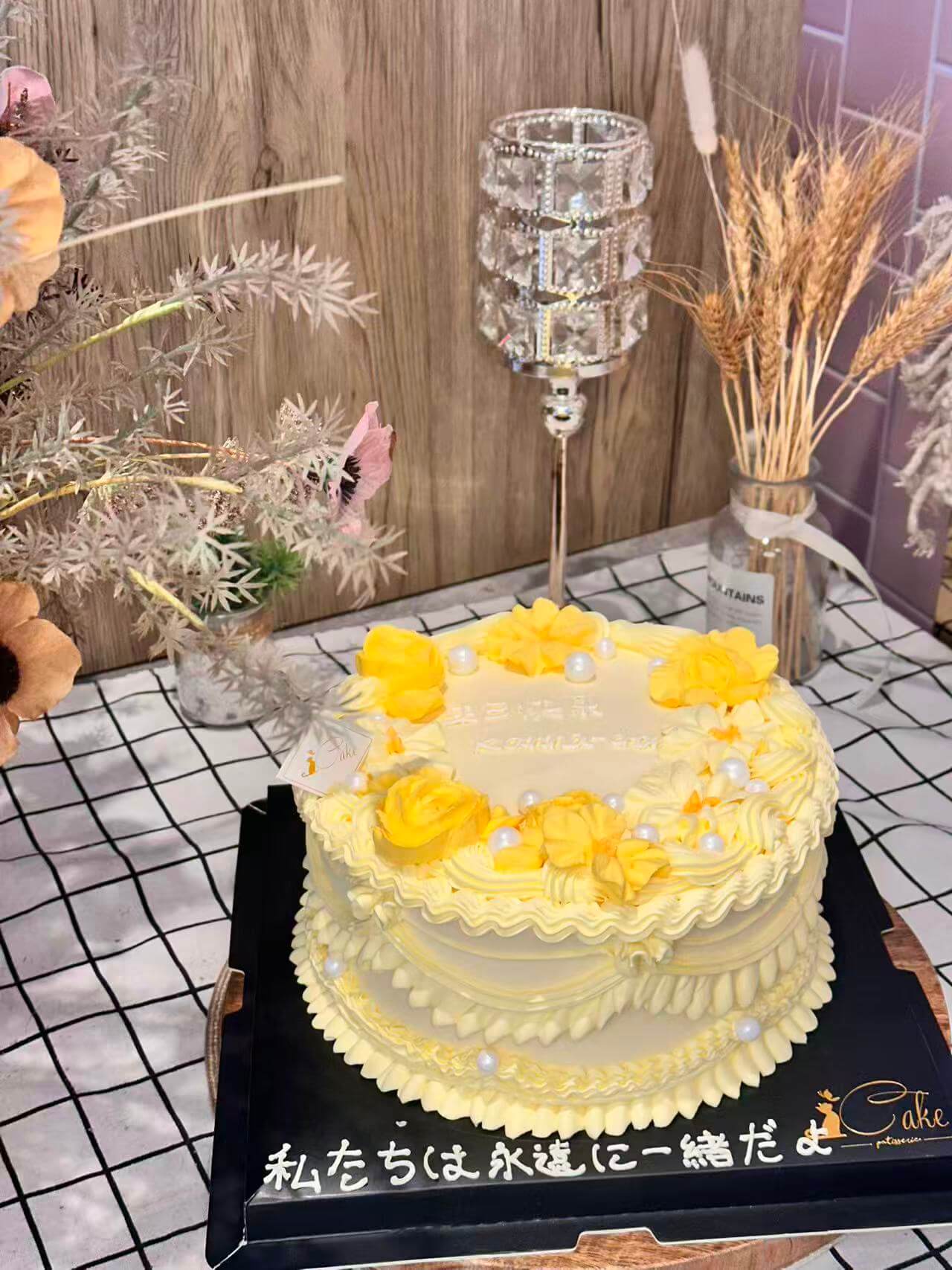 The Yellow Vintage Pearl Cake is designed with a vintage-inspired aesthetic. Each layer is carefully decorated with creamy yellow swirls and intricate borders that echo the charm of retro patisserie art. Adorned with delicate buttercream flowers and pearl accents, this cake glows with sophistication and gentle sweetness. The Japanese inscription on the base — “私たちは永遠に一緒だよ” (“We’ll always be together”) — adds a sentimental touch, making it a meaningful choice for couples or close friends celebrating their special moments together.